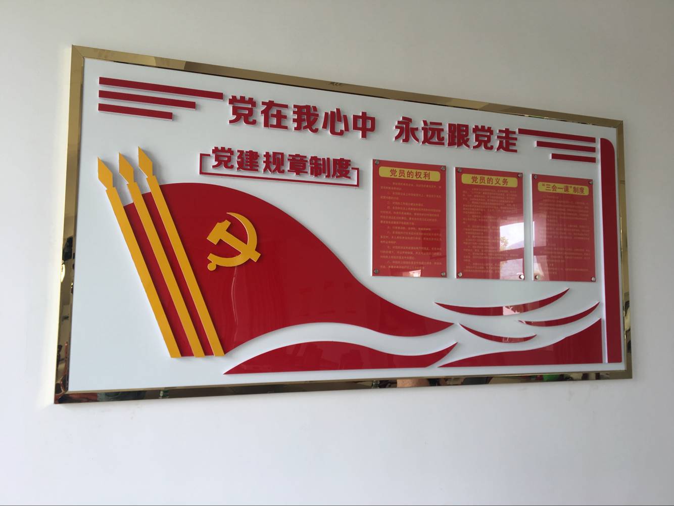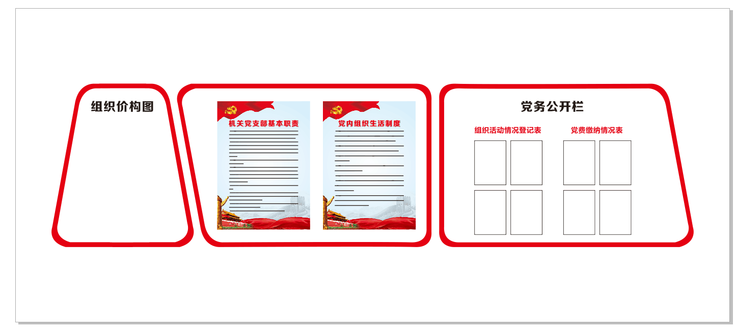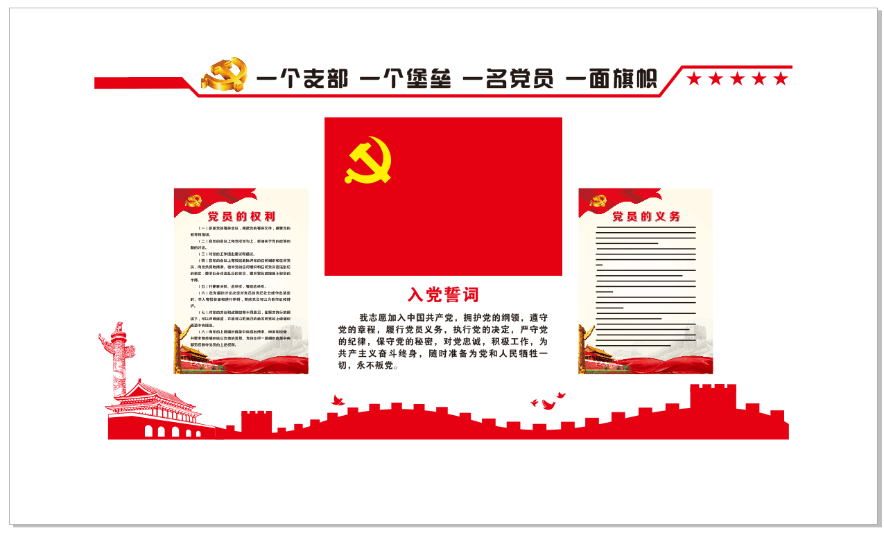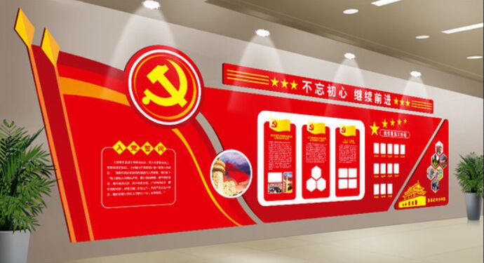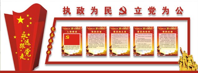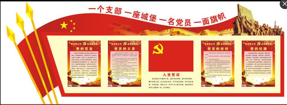 入党誓词、党员的义务、权利应放在主墙面,入党誓词在党旗街資的下方,党员的义务、权利在党旗和誓词的左、右呢姐位置;组织架构、岗位职责等其他(tā)内容體吧对称型悬挂在墙壁的两边。